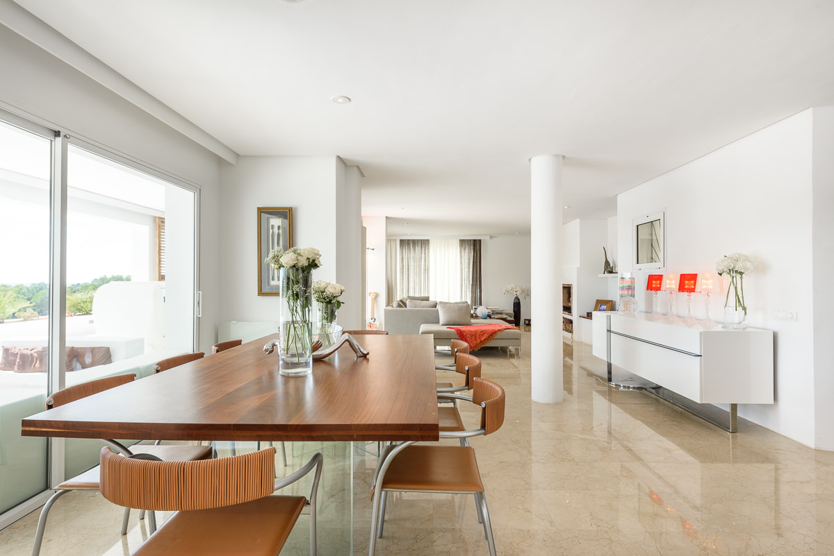 Villa Elle is an elegant holiday home located on a hillside above Cala Jondal beach, popular for its Blue Marlin beach club. The pine forest landscape drops onto the sparkling turquoise Mediterranean waters.